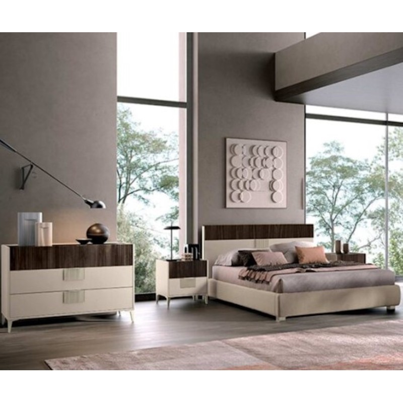 Il letto contenitore, dal design essenziale con testiera lineare, è accompagnato dai due comodini coordinati, impreziositi da complementi decorativi discreti e contemporanei.