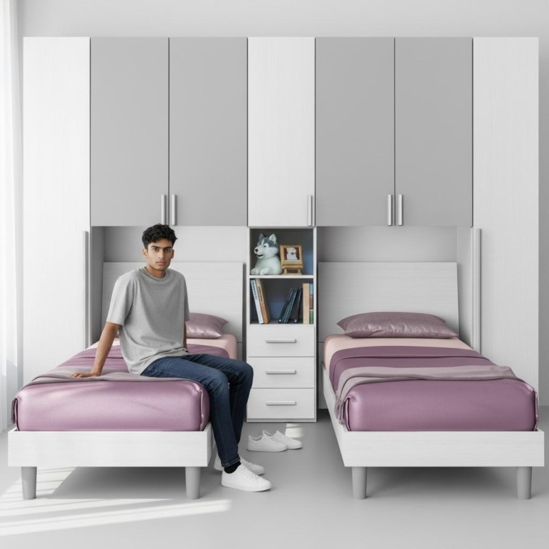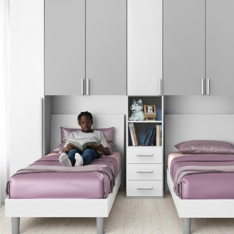 Un abbraccio di colori tenui e materiali naturali. La cameretta a ponte, con le sue tonalità delicate di bianco frassino e light grey, crea un'atmosfera calda e rassicurante. Un luogo dove i tuoi figli si sentiranno protetti e amati, pronti a esplorare il mondo con gioia e serenità.