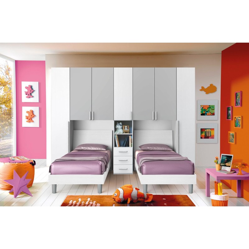 Spaziosa cameretta con 2 letti singoli divisi da uno spazio a giorno e cassetti.
