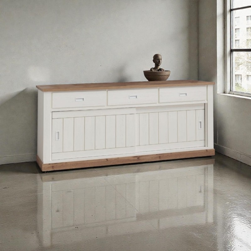 Mobile in stile rustico contemporaneo, con tre cassetti superiori e due ante scorrevoli con effetto dogato.